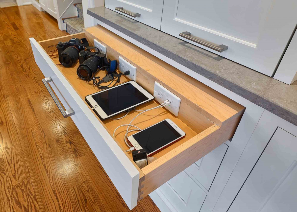 This drawer has outlets and USB ports built into the back so that electronics can be fully charged, close at hand, and not piled on the countertop.
