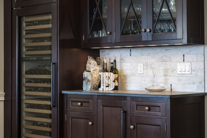 Cabinetry is Wood-Mode custom inset in a Nordic White paint finish. The island features a seating area with beautiful walnut cabinets in Wall Street special finish. The richness of the island cabinets is contrasted by Calcutta Gold marble countertops while dark marble tops, accented by a light marble tile backsplash, make the crisp, white cabinets pop. Appliances, including refrigerator and combined gas range and oven, are Subzero and Wolf. The dining area features a wet bar with a Subzero wine cooler and icemaker as well as dark walnut cabinets to match the island. The kitchen maintains the original charm of the grand, old home but better reflects the stately charm in a more functional, family space.