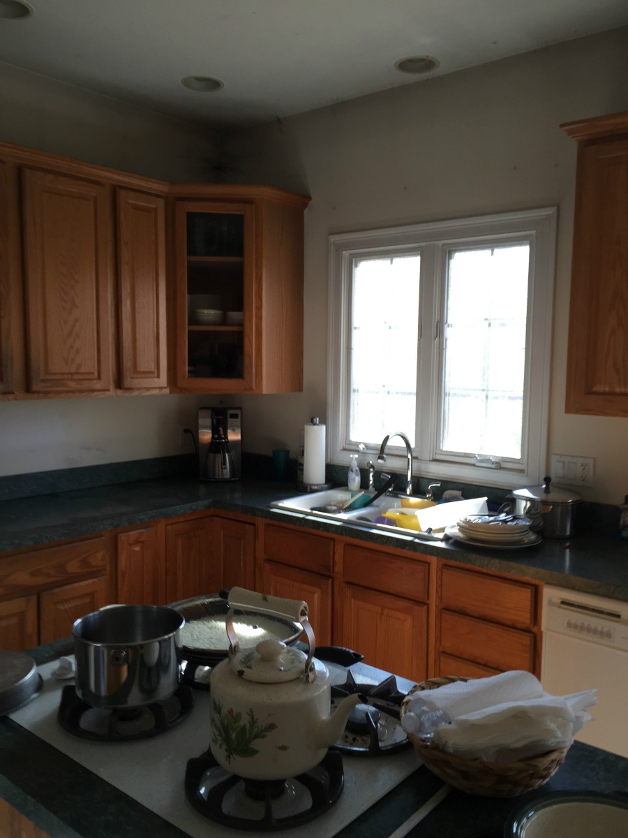 This outdated kitchen needs a complete overhaul with new kitchen cabinetry, appliances, and a more functional layout. The island is too small for the stove top to be functional and has no room for seating.